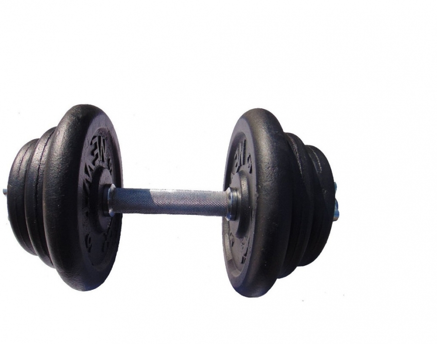 Предлегаем вашему вниманию отличную наборную гантель весом 21.5 кг. Гриф стальной, покрыт хромом, длина грифа 40 см, что позволит набрать гантель до 40 кг.