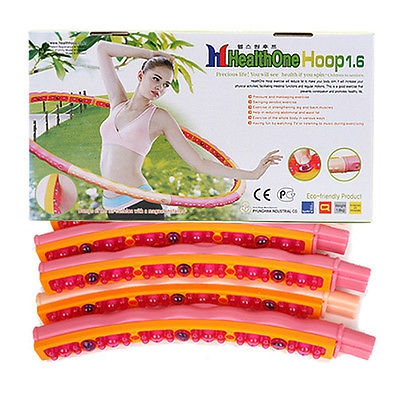 Этот обруч состоит из 8 частей, которые легко скрепляются между собой одним нажатием кнопки и так же легко раскладываются. В разобранном виде он занимает мало места и удобно транспортируется. Его вес составляет 1,6 кг, а диаметр – 107 см.