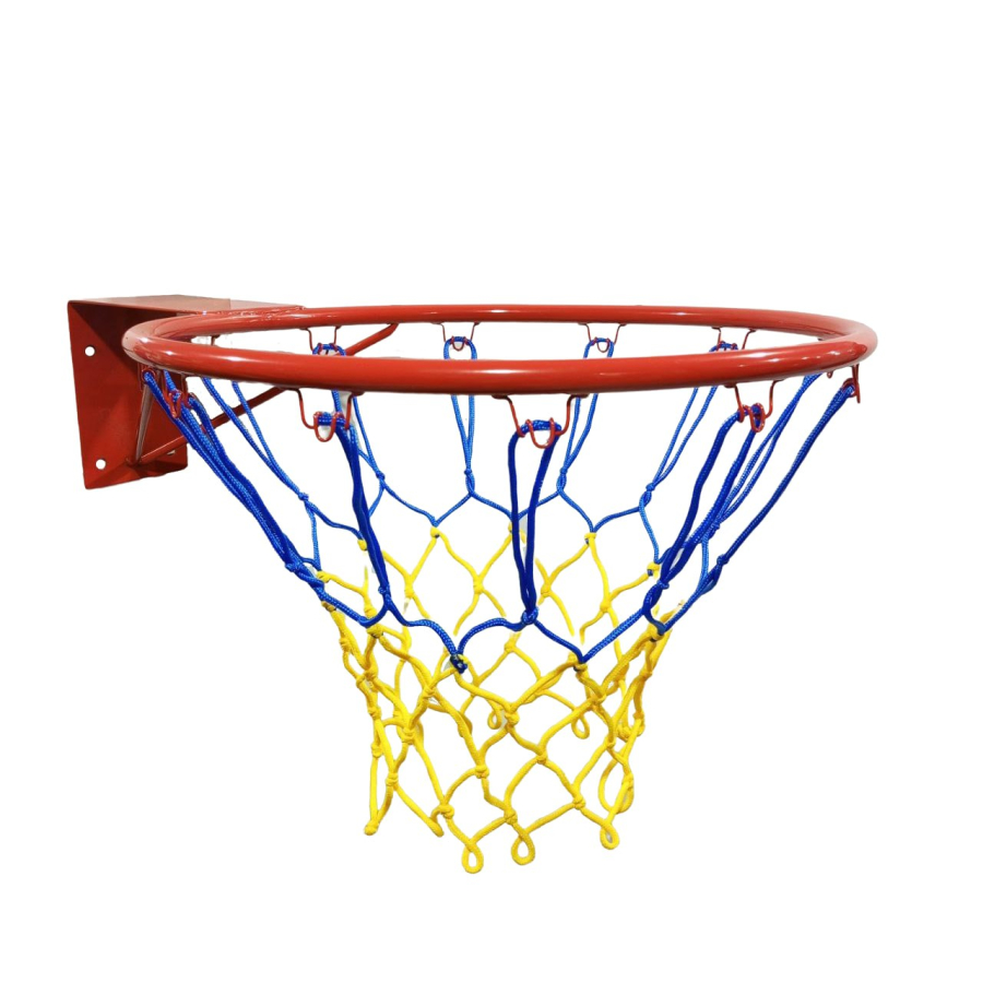 Стальное баскетбольное кольцо в комплекте с новой нейлоновой сеткой в сине-желтых украинских цветах. Сетка на баскетбольное кольцо крепится на 12 крючков.
