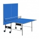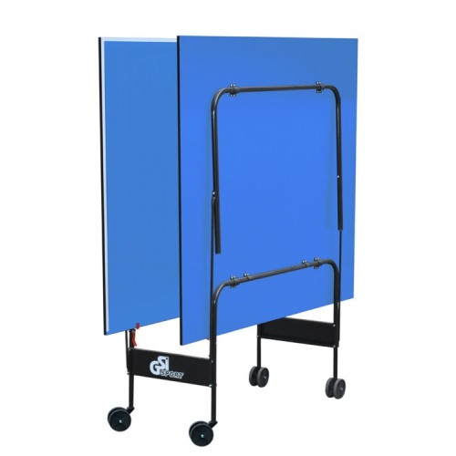 Теннисный стол для закрытых помещений. В качестве материала для игровой поверхности используется специально обработанная древесностружечная плита (ДСП) толщиной 16 мм. На ДСП нанесено специальное антибликовое пластиковое покрытие синего цвета. Теннисный стол базируется на удобной тележке, изготовленной из металлического трубчатого профиля диаметром 25 мм с полиэфирным покрытием. Конструкция стола позволяет тренироваться в одиночку. Стол легко перемещается на 4-х сдвоенных колесах диаметром 105 мм, 2 колеса маневренные. Стол комплектуется сеткой.