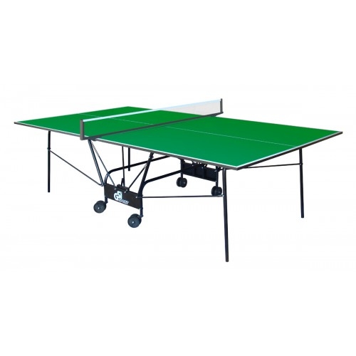 Теннисный стол для закрытых помещений. В качестве материала для игровой поверхности используется специально обработанная древесностружечная плита (ДСП) толщиной 16 мм. На ДСП нанесено специальное антибликовое пластиковое покрытие синего цвета. Теннисный стол базируется на компактной удобной тележке, изготовленной из металлического трубчатого профиля диаметром 25 мм с полиэфирным покрытием. Конструкция стола позволяет тренироваться в одиночку. Стол легко перемещается на 4-х сдвоенных колесах диаметром 105 мм, 2 колеса маневренные. Стол комплектуется сеткой.