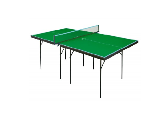 Теннисный стол для закрытых помещений. В качестве материала для игровой поверхности используется специально обработанная древесностружечная плита (ДСП) толщиной 16 мм. На ДСП нанесено специальное антибликовое пластиковое покрытие зелёного цвета. Игровая поверхность оснащена металлической рамой (прямоугольный профиль 30*20 мм). Каждая половина столешницы имеет независимую разборную конструкцию и базируется на четырех складываемых ножках, которые имеют жесткие фиксаторы в игровом положении. Конструкция изготовлена из металлического трубчатого профиля диаметром 25 мм с полиэфирным покрытием. Сетка в комплекте.