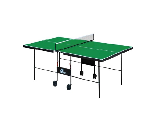 Теннисный стол для закрытых помещений. В качестве материала для игровой поверхности используется специально обработанная древесностружечная плита (ДСП) толщиной 16 мм. На ДСП нанесено специальное антибликовое пластиковое покрытие зеленого цвета. Игровая поверхность оснащена металлической рамой (прямоугольный профиль 30*20 мм).
