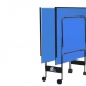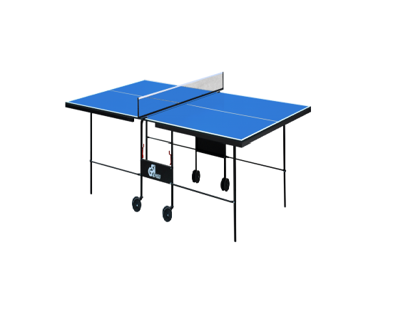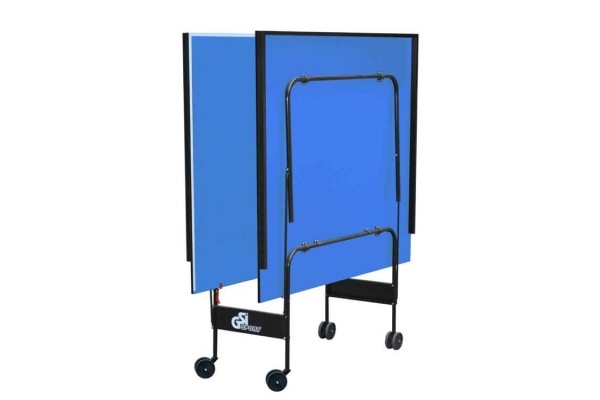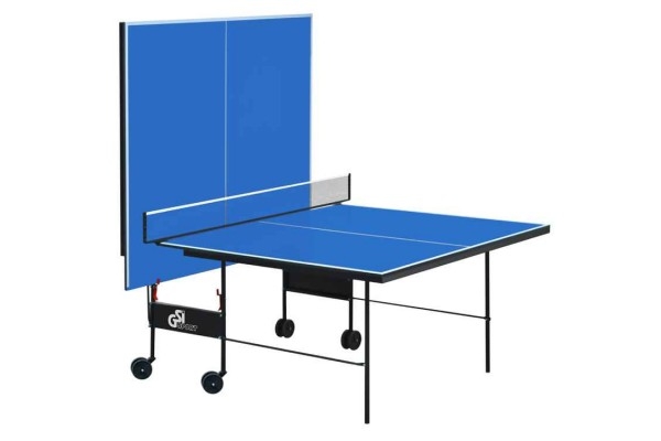 Теннисный стол для закрытых помещений. В качестве материала для игровой поверхности используется специально обработанная древесностружечная плита (ДСП) толщиной 18 мм. На ДСП нанесено специальное антибликовое пластиковое покрытие синего цвета. Игровая поверхность оснащена металлической рамой (прямоугольный профиль 30*20 мм). Теннисный стол базируется на удобной тележке, изготовленной из металлического трубчатого профиля диаметром 25 мм с полиэфирным покрытием. Конструкция стола позволяет тренироваться в одиночку. Стол легко перемещается на 4-х сдвоенных колесах диаметром 105 мм, 2 колеса маневренные. Стол комплектуется сеткой.