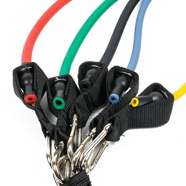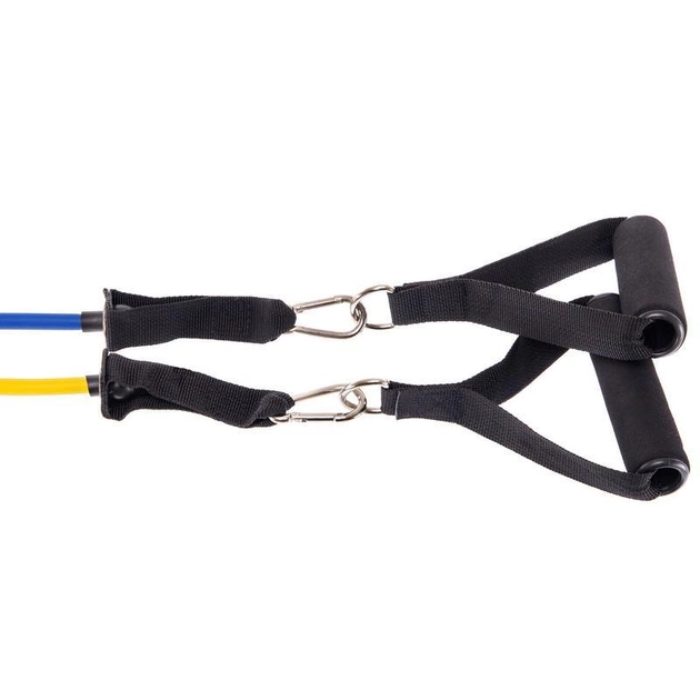Спортивный инвентарь состоит из трубчатых латексных жгутов и эргономичных пластиковых ручек. Изделие способно выдерживать огромные регулярные нагрузки без потери спортивных качеств. Благодаря наличию 5 жгутов между ручками можно регулировать силовое натяжение в зависимости от уровня физического развития и желаемых результатов. С обеих сторон расположены металлические карабины. К карабинам крепятся рукоятки либо манжеты на липучках. Для выполнения статических упражнений в комплекте предусмотрен дверной анкер. С его помощью можно зафиксировать одну сторону эспандера. Суммарная нагрузка от 5 эспандеров составляет 45.4 кг. Чтобы избежать растяжений и травм перед использованием эспандера, следует настроить под себя.