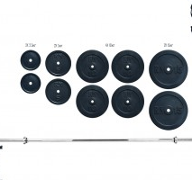 В набор входит:Гриф – прямой 1.8 метра, диаметром 2.8 см. весом 10 кг. гайки - 2шт.Диски на штангу:2х15 кг.4х10 кг.;2х5 кг.2х2.5 кг.