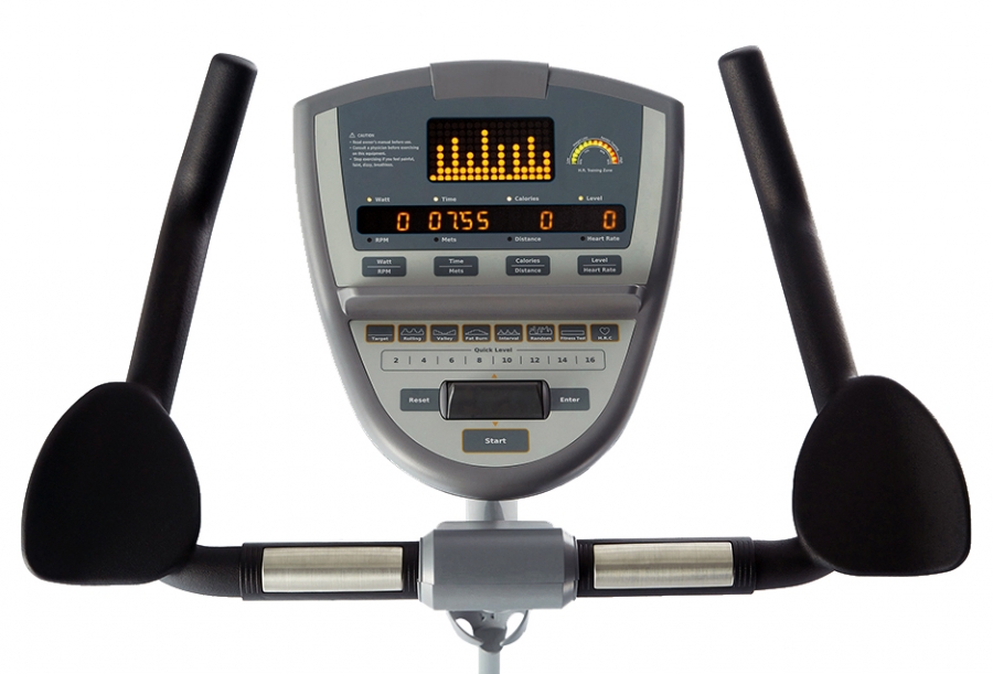 Показания дисплея: Время, дистанция, пульс, нагрузка в ваттах, обороты в минуту, уровень нагрузки, калории