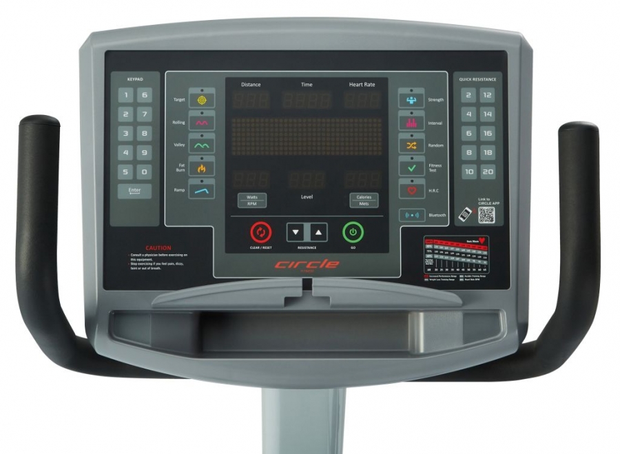 Показания дисплея: Время, дистанция, пульс, нагрузка в ваттах, обороты в минуту, уровень нагрузки, калории